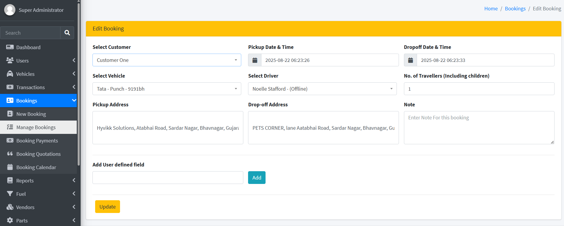 o   **Km (mileage)** - Displayed value (Km) guides the admin to decide the rate of ride; however, here, **10 km** can be modified by the admin while generating the invoice.