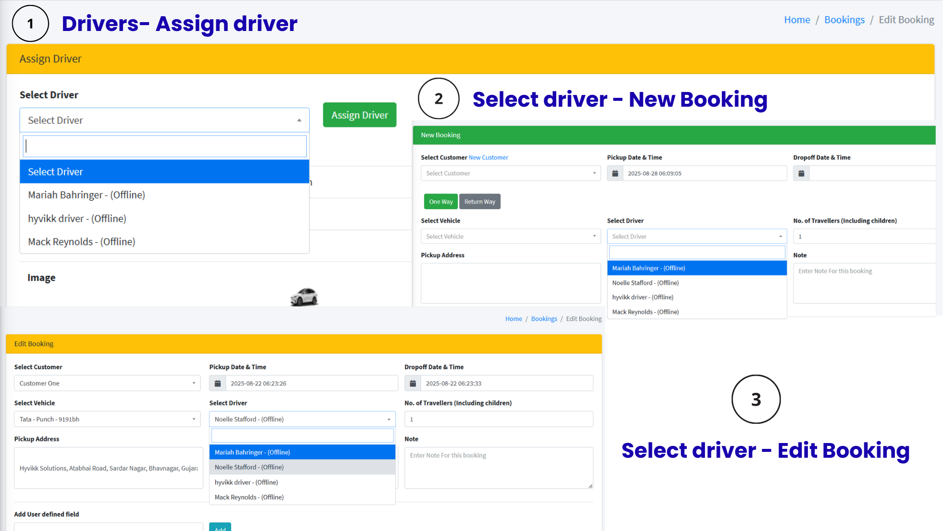 Driver availability is a feature that allows the admin to know whether a driver is free before assigning a booking. Once the driver updates their availability in the app, the admin can see it as online or offline. However, the admin can still assign the driver to a booking if needed.