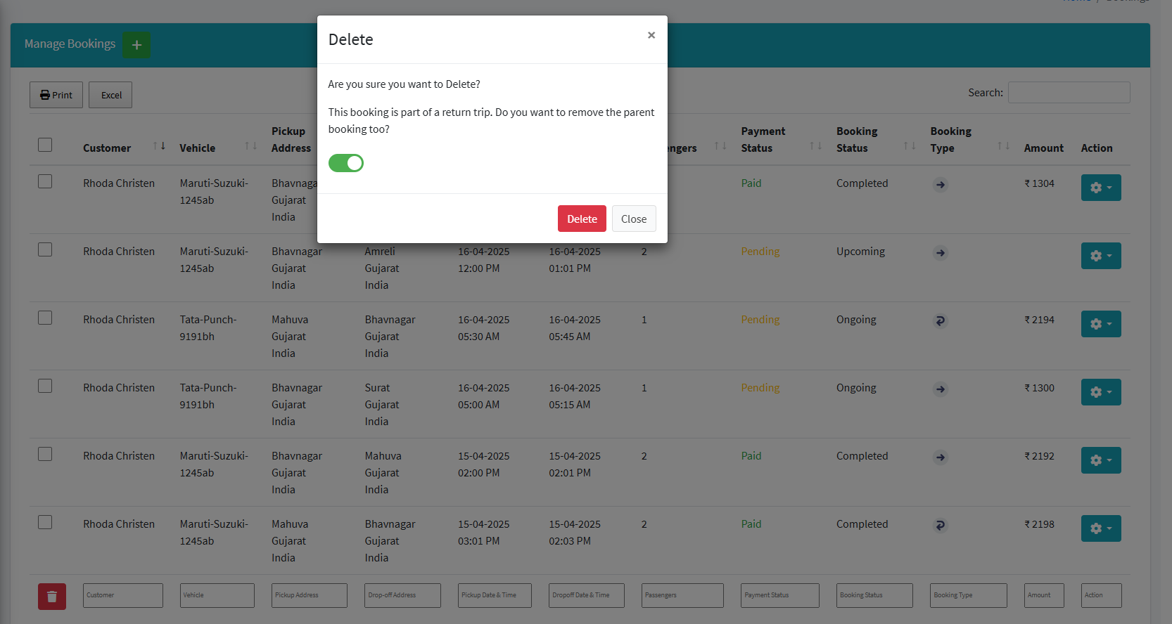 green toggle icon is enabled, both bookings will be deleted. After deleting one booking of the round trip, the remaining booking will be treated as a single or normal booking.
