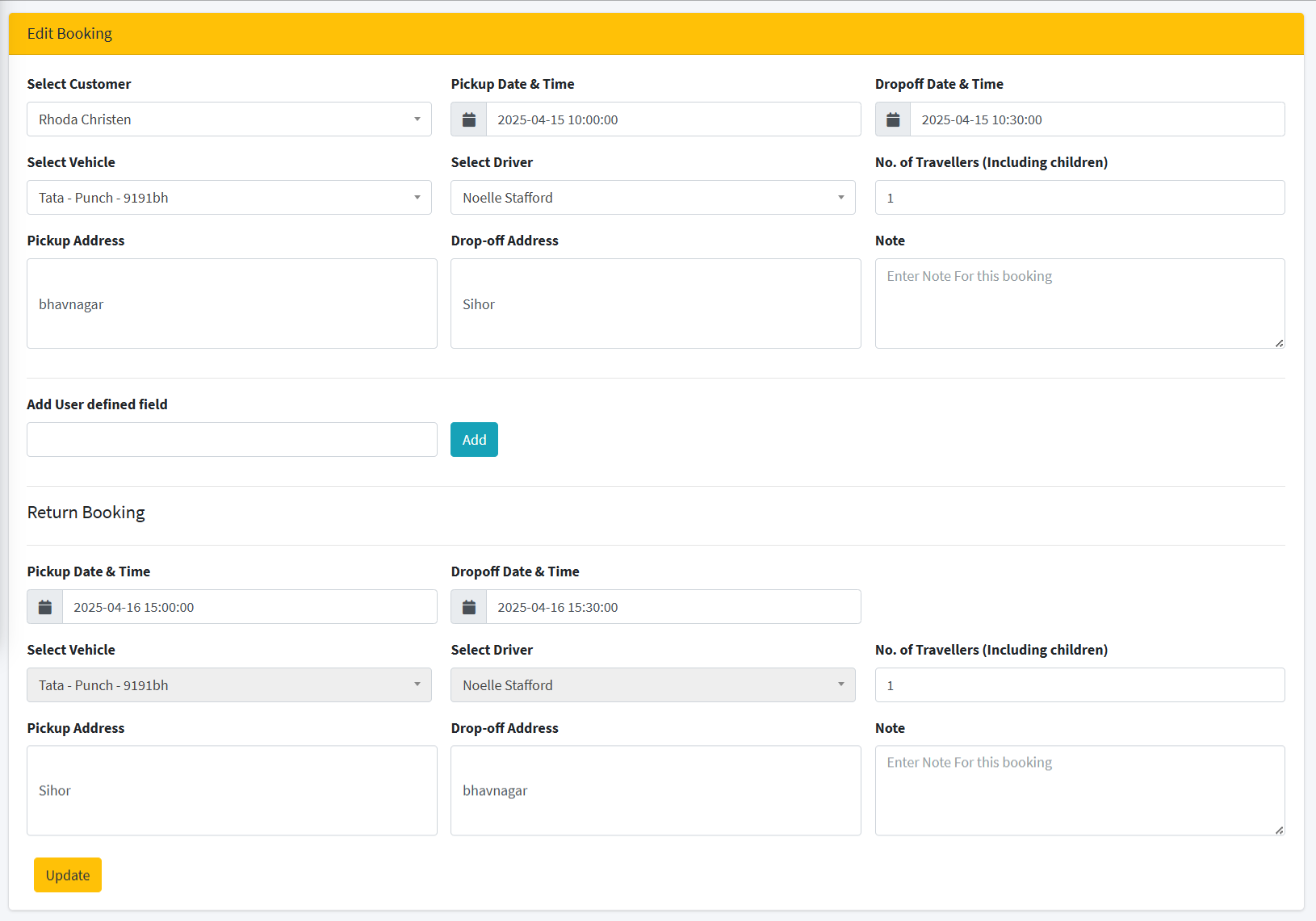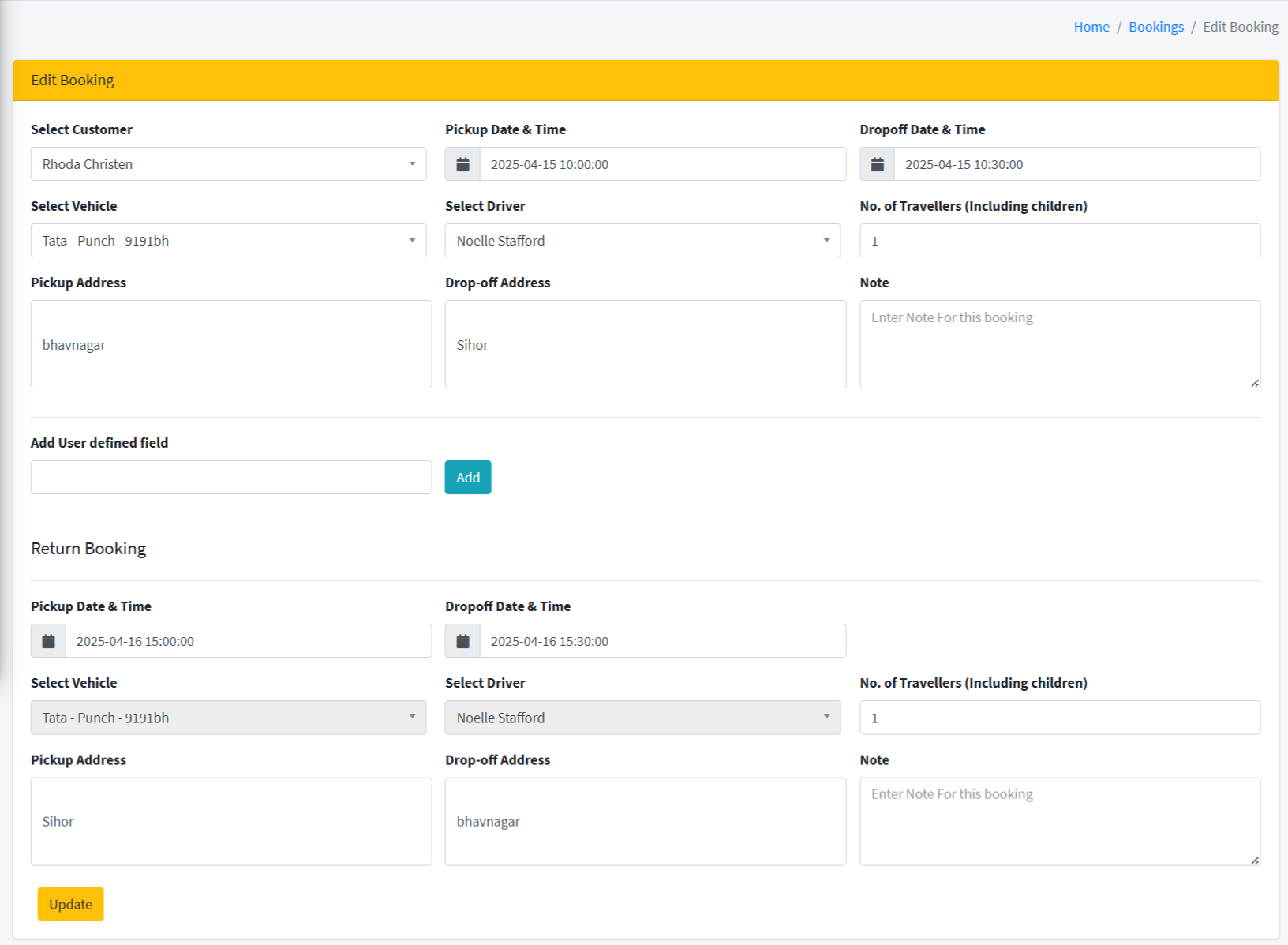 The admin cannot modify the vehicle or driver for incoming or return bookings; however, both bookings can be modified at any time.
