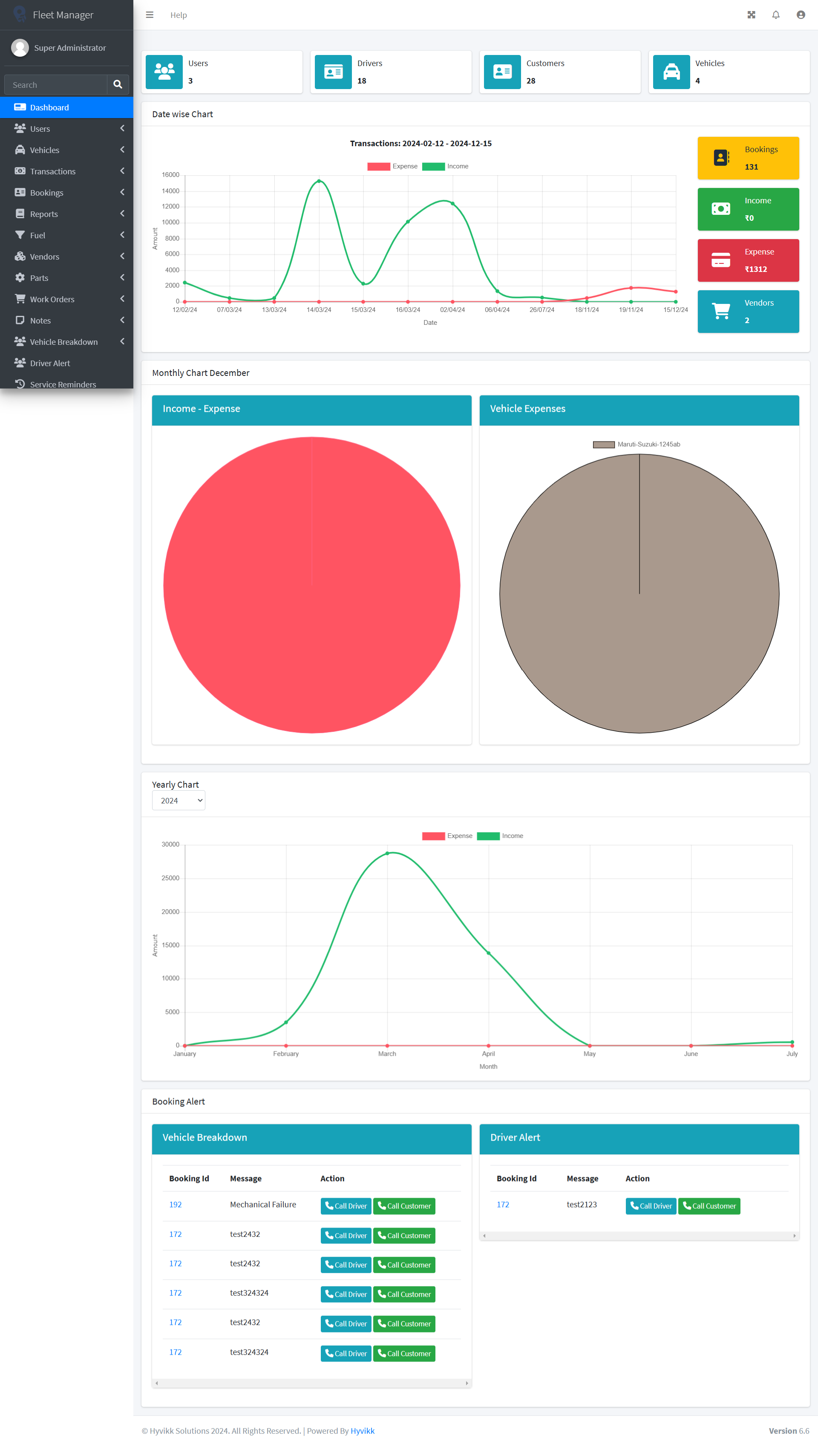 The dashboard provides an overview of income and expense, the number of users (Users, Customers, Drivers & Vendors), and vehicles with their bookings.