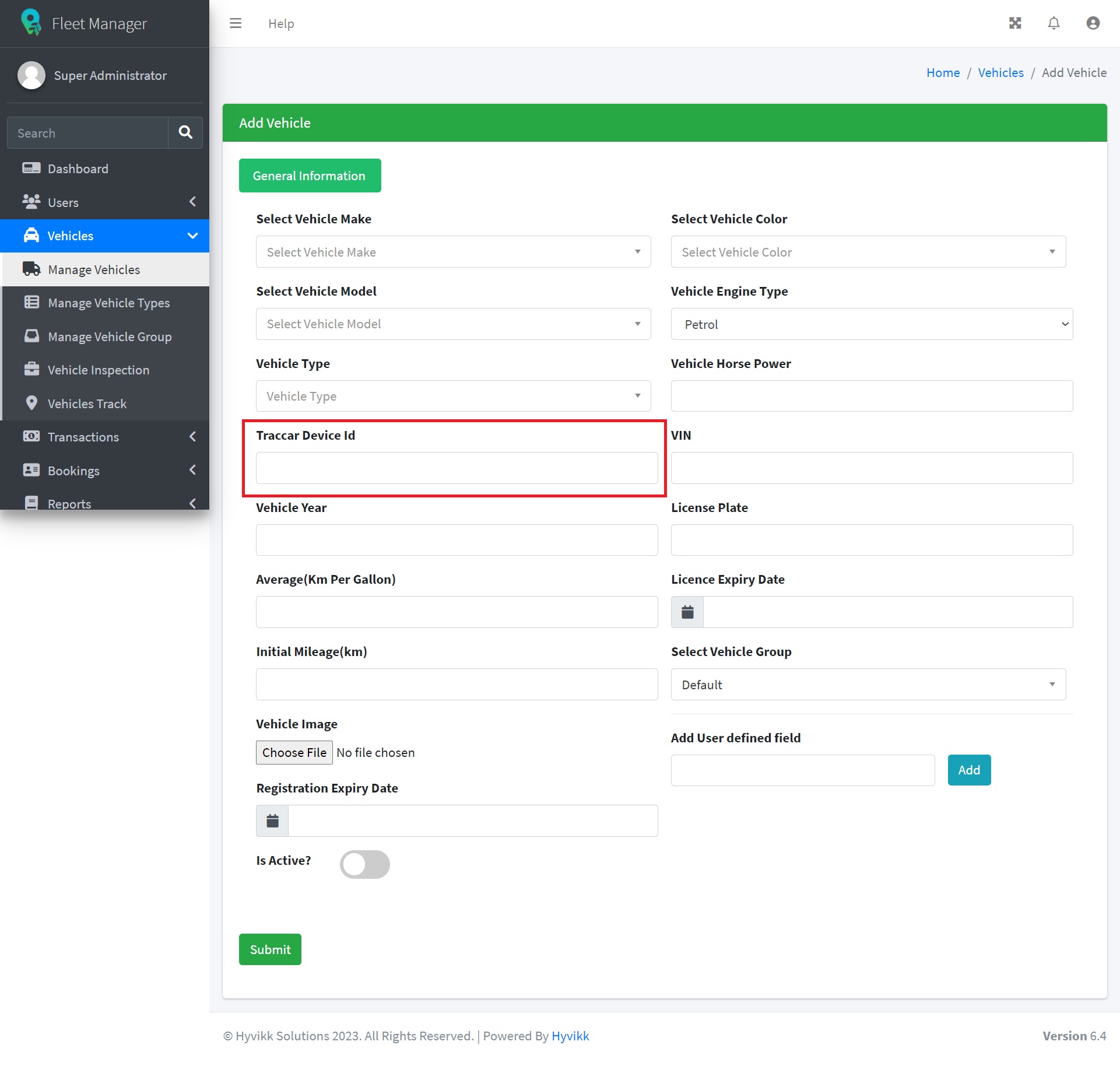 **Traccar Device Id :** In order to monitor the vehicle's location, the administrator needs to input the traccar device id when add or edit a vehicle.<br>